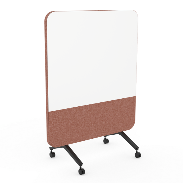 A floor-standing whiteboard sized 1100 × 1504.2 × 40 mm combining an ultra-white tempered glass front (with fabric detail) and a 100% PET acoustic core wrapped in polyester fabric. The rear face is fully covered in polyester acoustic fabric. The product provides sound absorption, is mold- and moisture-resistant, and supports file tags. More than 20 fabric colour options are available. |