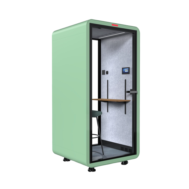 Premium single-person acoustic pod with height-adjustable desk for sit/stand workflows. |